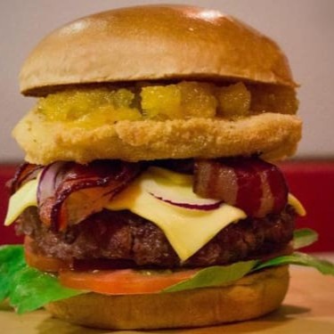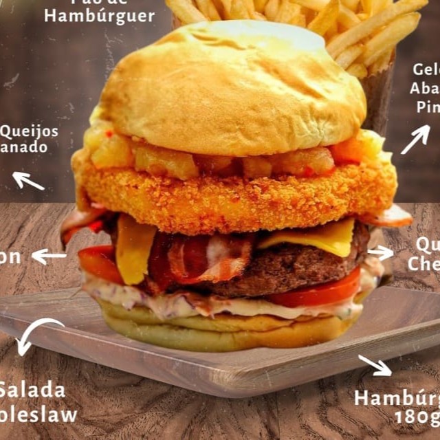 Pão de hamburguer, geleia de abacaxi com pimenta, mix de 3 queijos empanado crispy, bacon,fatiade quejo cheddar,hamburguer 180g in natura, tomate e salada coleslaw.