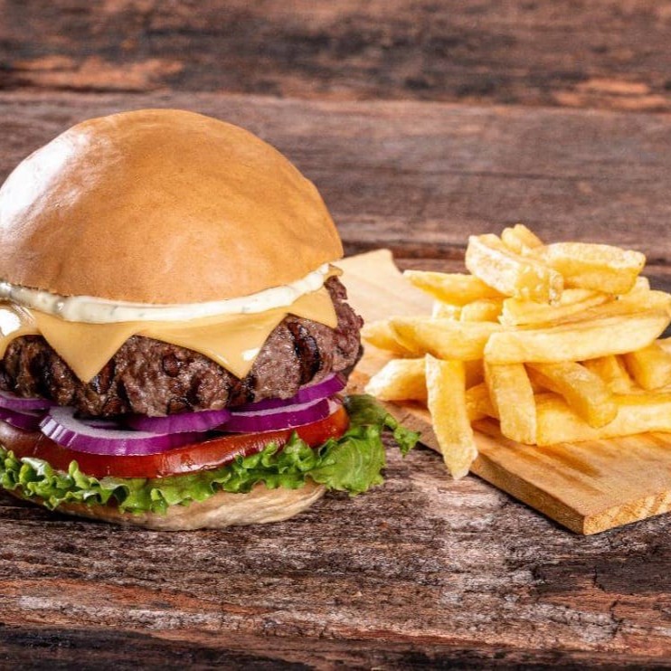 Pão de hambúrguer artesanal, maionese verde da casa, queijo prato, hambúrguer 180g, cebola roxa, tomate e alface. Acompanha Fritas Individual