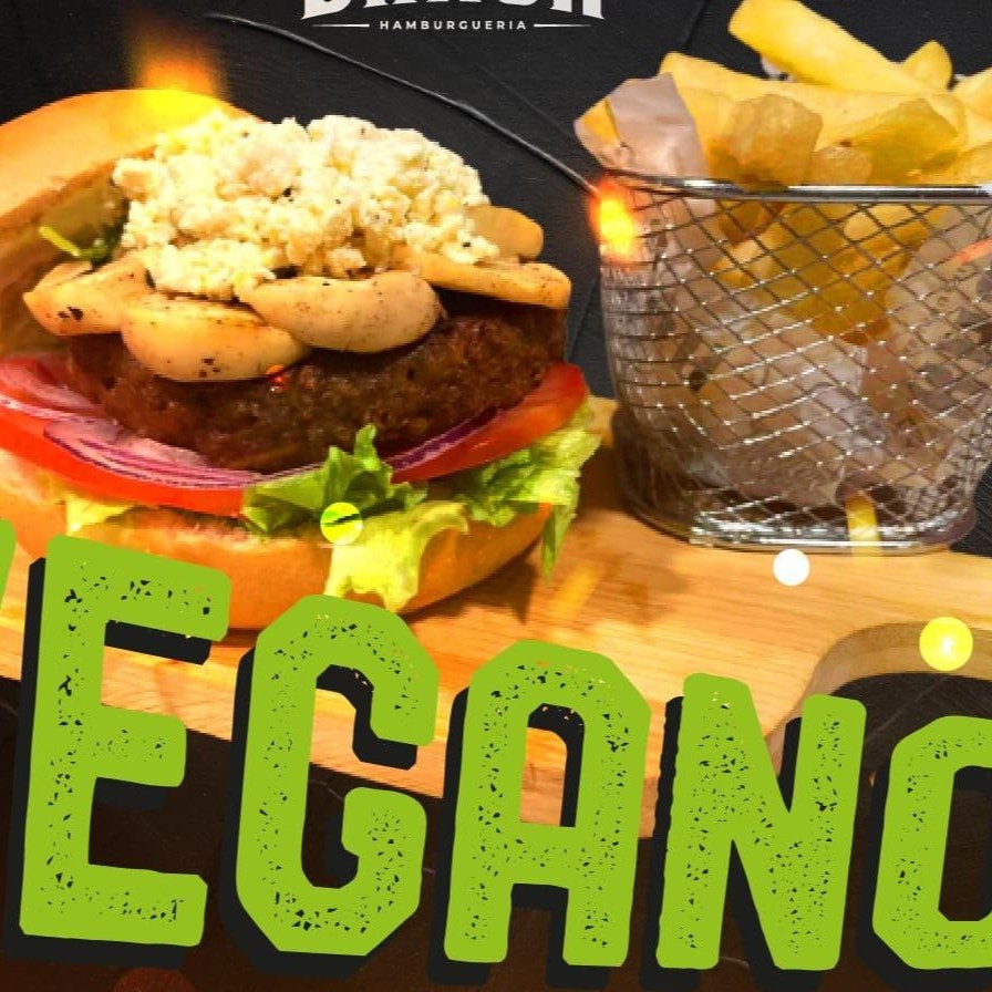 Pão de hamburguer artesanal, 100% vegano, maionese verde da casa vegana, tofu temperado, champignon salteado, futuro burguer (100% plantas), cebola roxa, tomate e alface Acompanha Fritas Individual