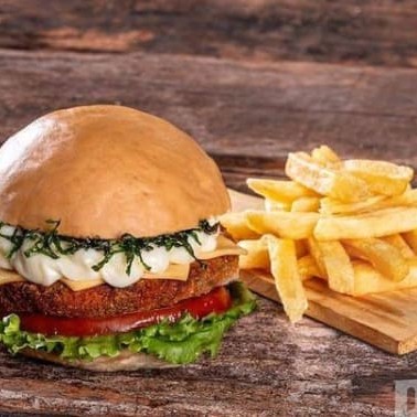 Pão de hambúrguer artesanal, Catupiry Original, queijo prato, burguer de proteína de soja artesanal, cebola, tomate e alface. Acompanha Fritas Individual