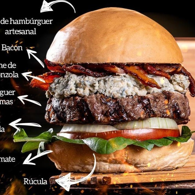 Pão de hambúrguer artesanal, bacon, creme de gorgonzola, burguer de 180g, cebola chapeada, tomate e rúcula. Acompanha Fritas Individual