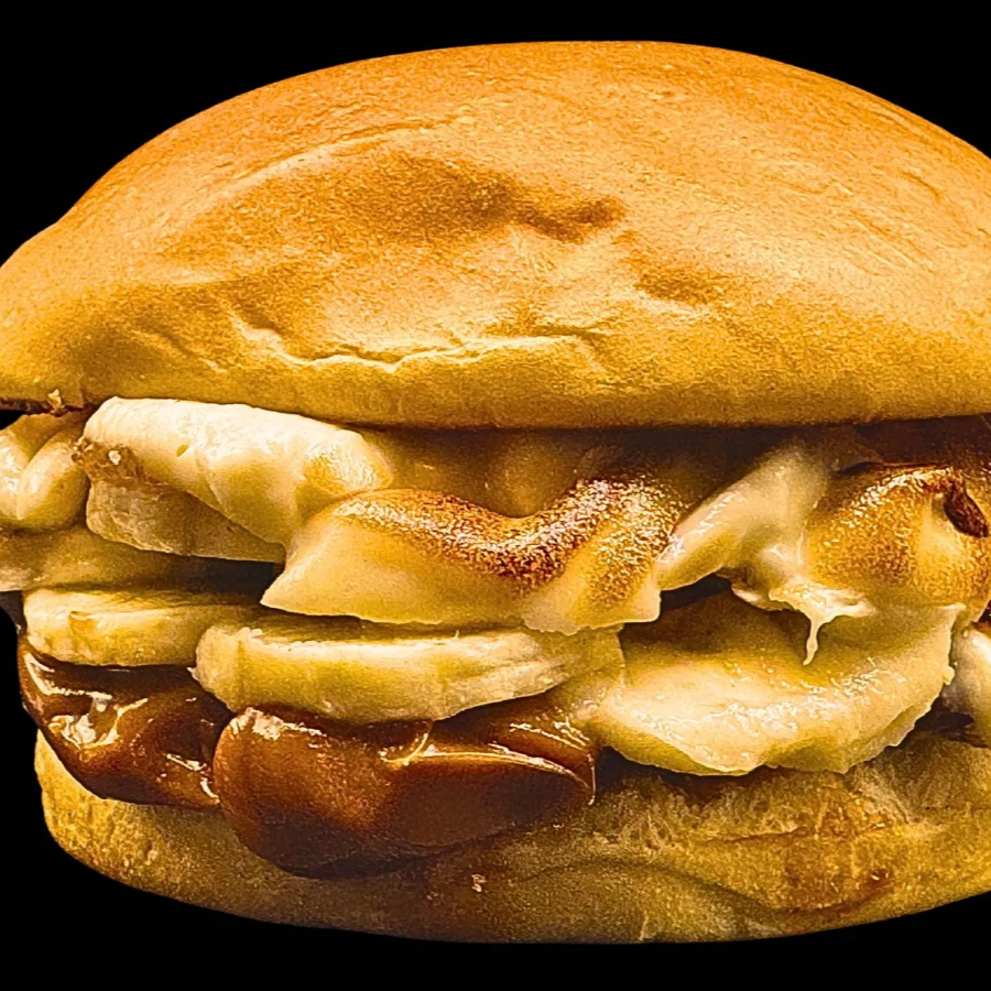 Pão brioche selado na manteiga, açúcar e canela, doce de leite, banana caramelizada no açúcar e canela e chocolate branco flambado no maçarico .