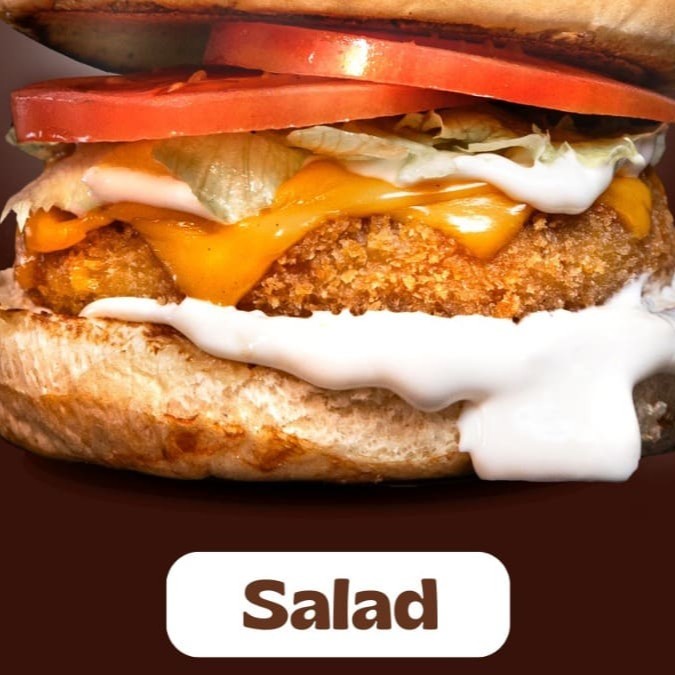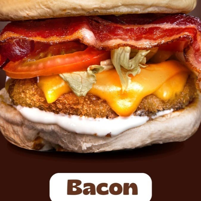 Burger de 150g frango empanado , queijo cheddar fatiado, alface ,tomate ,bacon e maionese .Acompanha 1 cestinha de batata. Coloque na Observação qual molho de sua preferência Molho De Bacon Ou Molho Verde