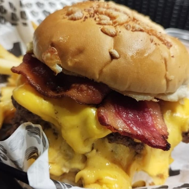 3 carnes smash 100grs,american cheese,bacon na chapa,barbecue,picles e maionese.Acompanha 1 porção individual de fritas. Coloque na Observação qual molho de sua preferência Molho De Bacon Ou Molho Verde