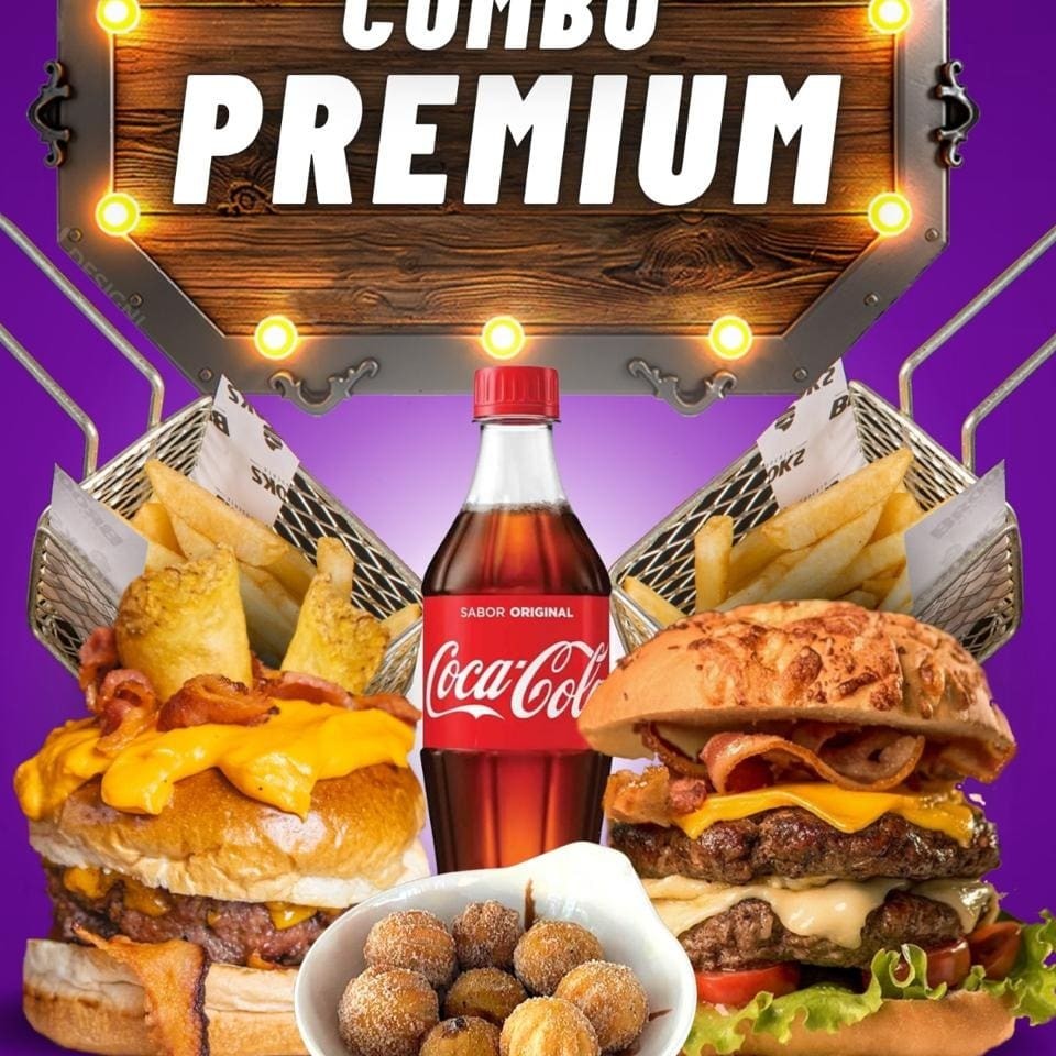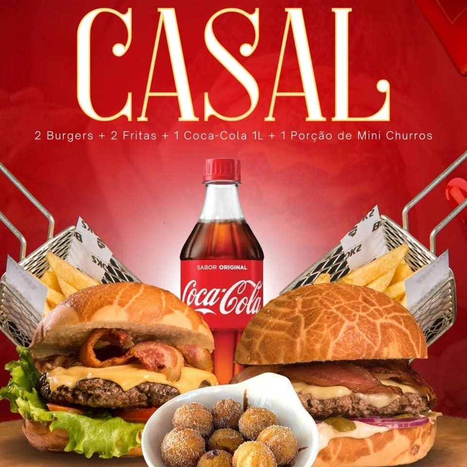 2 - lanches 2 - fritas 70g 2 - molhos da casa (opcional) 1 - refrigerante 1 L 1 - porção mini churros doce de leite (8 unidades)
