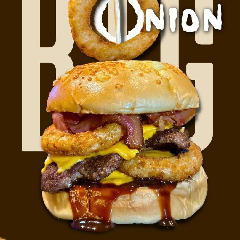 O 'Big Onion' é uma sensacional novidade na categoria 'Lançamentos', que já vem acompanhada de fritas e dois irresistíveis molhos. Esse incrível prato é composto por duas suculentas carnes smash de 100grs cada, cuidadosamente seladas para manter todo o suco e sabor lá dentro. Entre elas, duas generosas camadas do mais puro queijo cheddar fatiado da Polenghi, derretido à perfeição. Acompanhando, temos anéis de cebola empanados, crocantes e dourados, e fatias de bacon crocante, trazendo um toque defumado ao prato. Para finalizar, uma camada de molho barbecue, com seu sabor adocicado e levemente picante, equilibrando todos os componentes deste prato. As fritas que acompanham são sequinhas e douradas. Coloque na Observação qual molho de sua preferência Molho De Bacon Ou Molho Verde