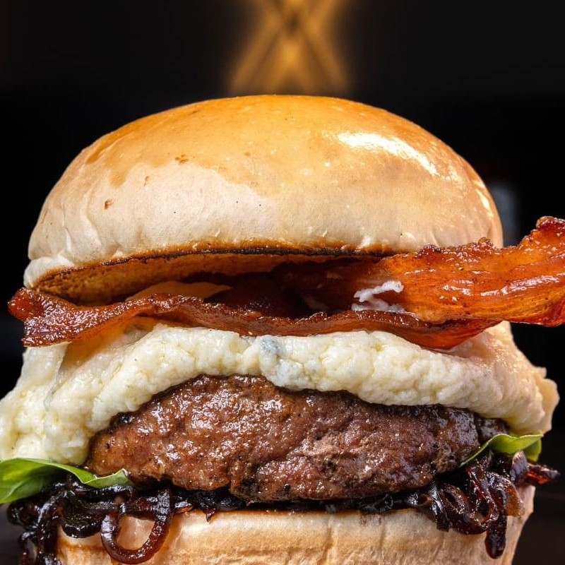 Hamburguer 180gr , creme de gorgonzola , rúcula fresquinha, bacon crocante e cebola caramelizada . Observação qual molho de sua preferência Molho De Bacon Ou Molho Verde.