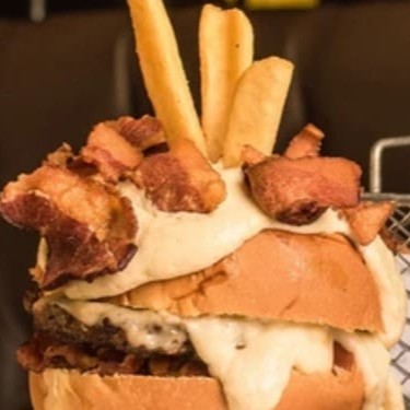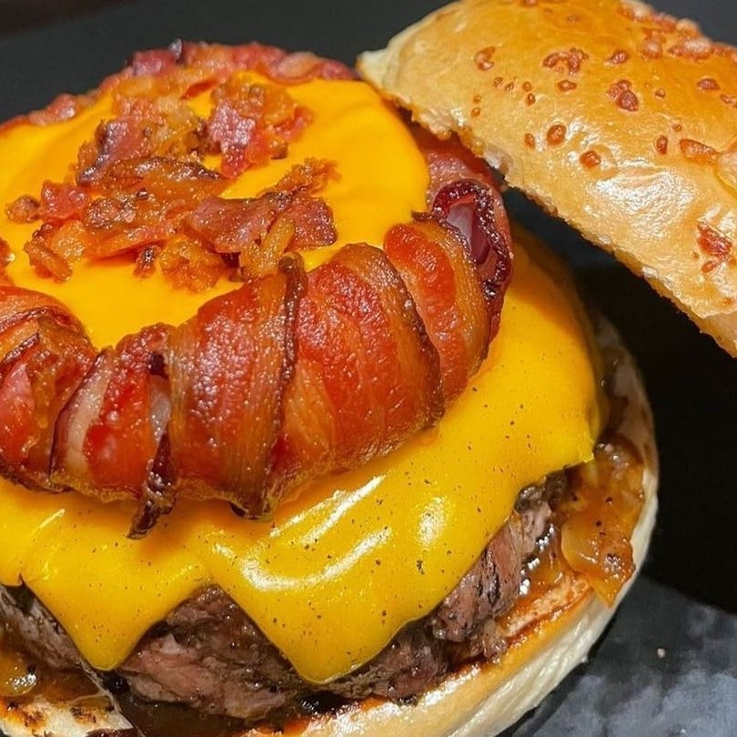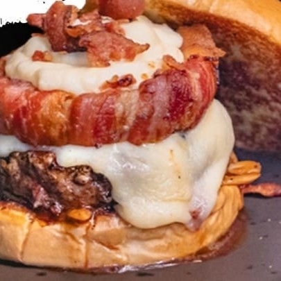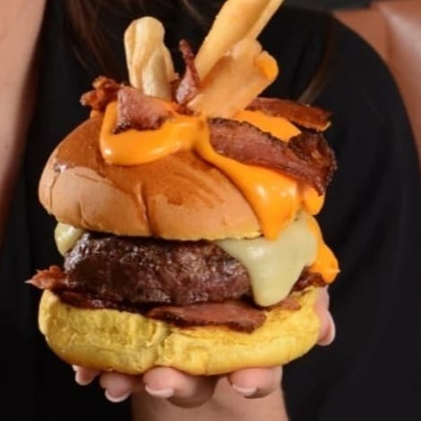 2 burgers de 100gr prensado, queijo mussarela, picles, cebola roxa, bacon na chapa e maionese tradicional no pão.Acompanha fritas.Coloque na Observação qual molho de sua preferência Molho De Bacon Ou Molho Verde