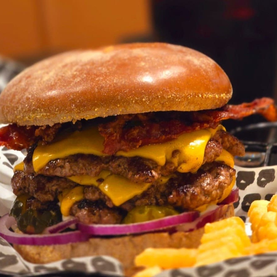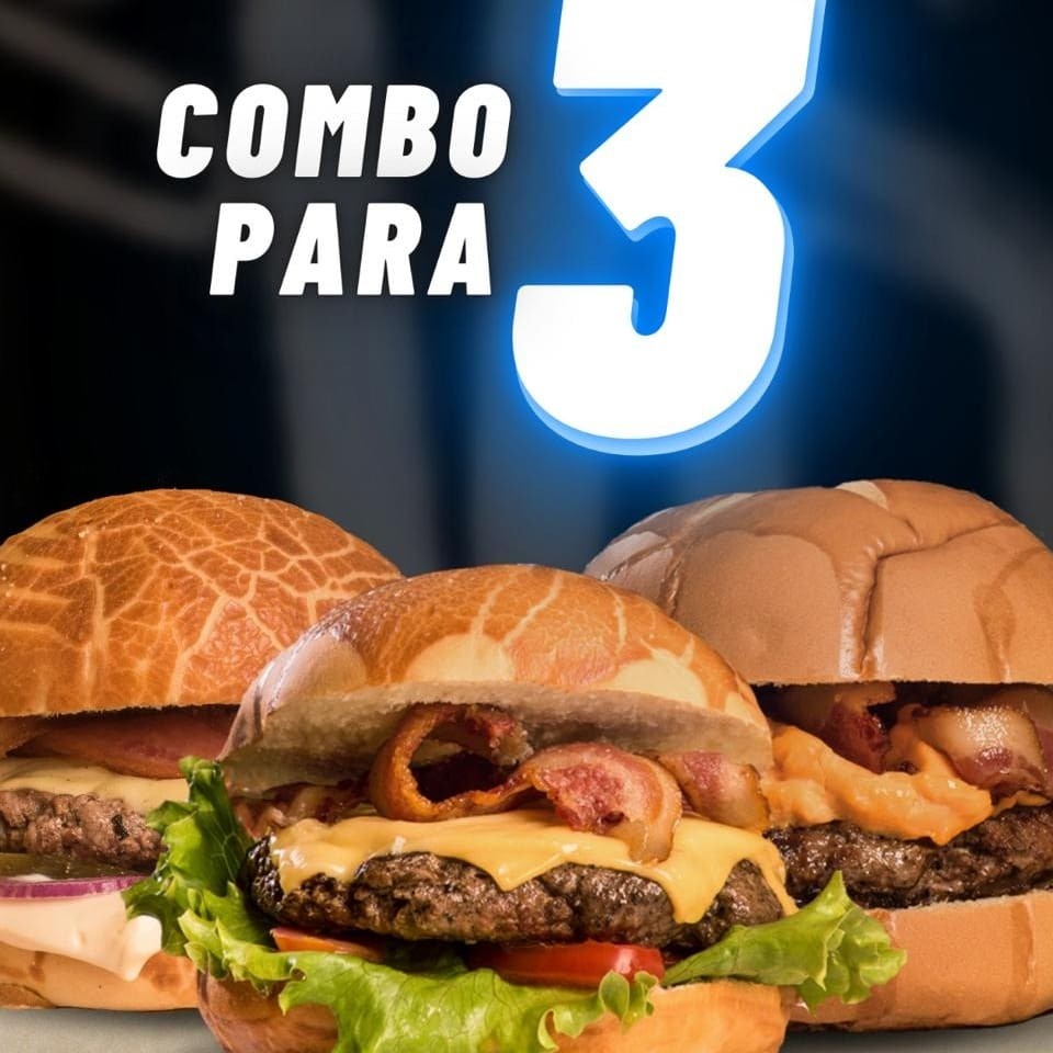 3 burgers de 100gr prensado, queijo cheddar fatia , picles, cebola roxa, bacon na chapa e maionese tradicional no pão Acompanha fritas.Coloque na Observação qual molho de sua preferência Molho De Bacon Ou Molho Verde