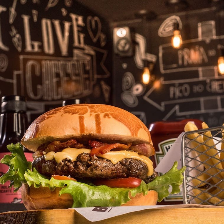 Hambúrguer de carne angus, queijo prato, bacon , alface americana e tomate . Acompanha fritas.Coloque na Observação qual molho de sua preferência Molho De Bacon Ou Molho Verde