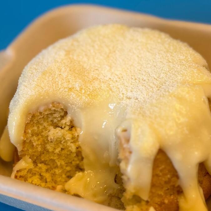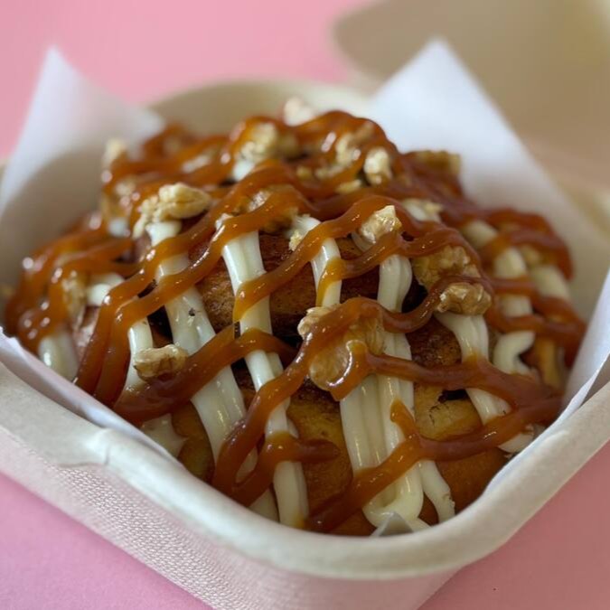 Pãozinho de canela com cobertura de cream cheese, caramelo salgado e nozes
