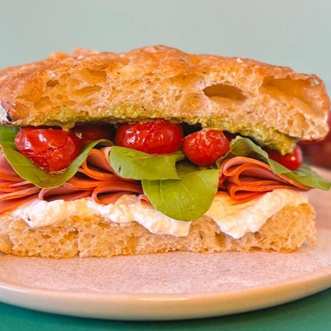 Sanduíche de focaccia com lombo defumado, creme de ricota, pesto, rúcula, tomate cereja confit e picles de cebola