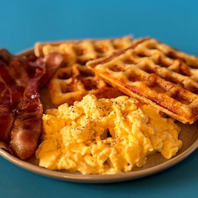 2 waffles de pão de queijo acompanhados de ovo mexido cremoso e fatias de bacon