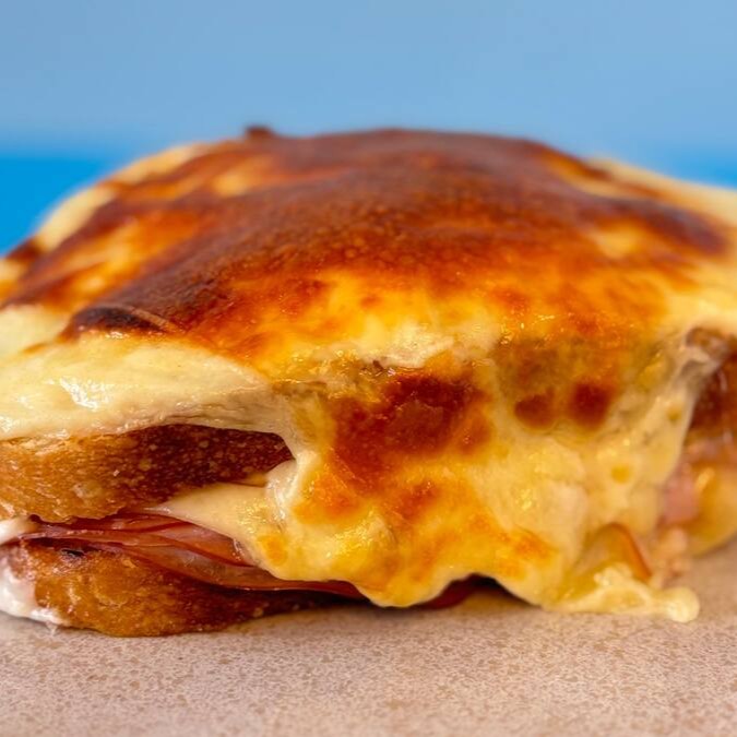Pão artesanal com fermentação de 24h, peito de peru, queijo mussarela, ovo frito, molho bechamel, gratinado com queijo. Pão mais crocante e com sabor mais presente.
