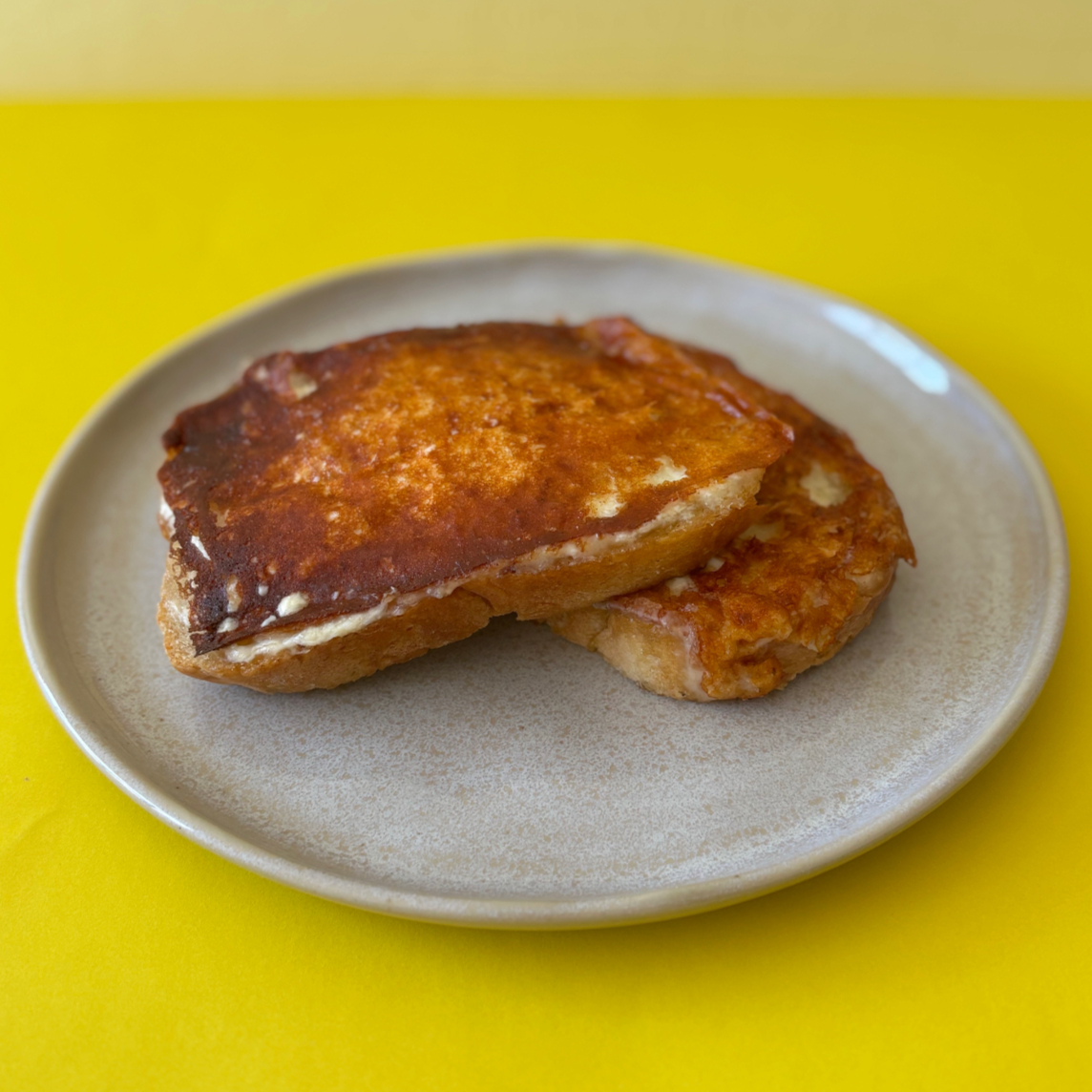 2 fatias de pão italiano com requeijão e queijo feitos na chapa.