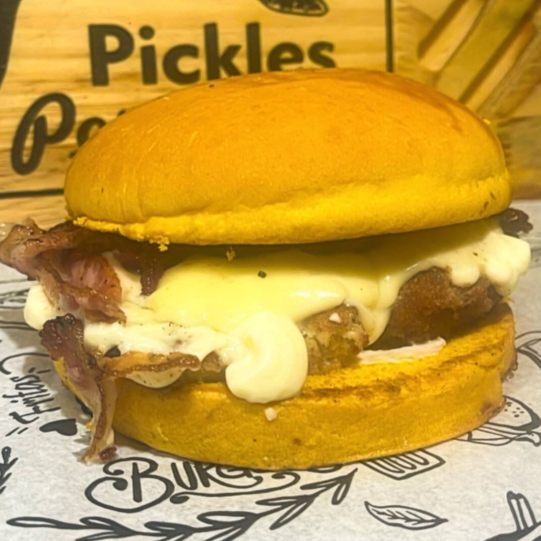 Pão de brioche, frango empanado frito, Catupiry, bacon e maionese.
