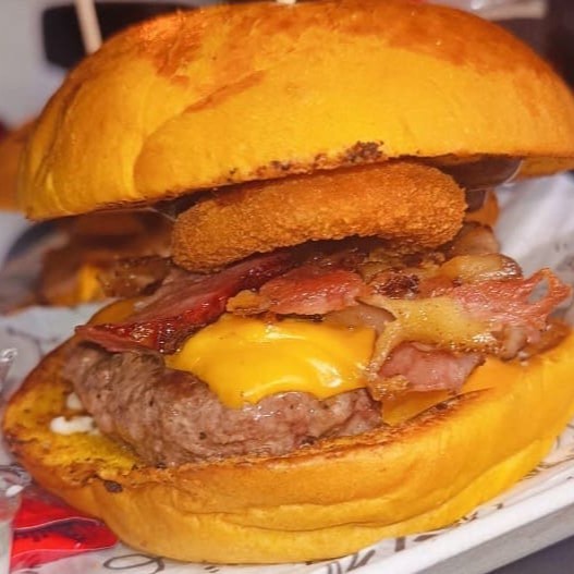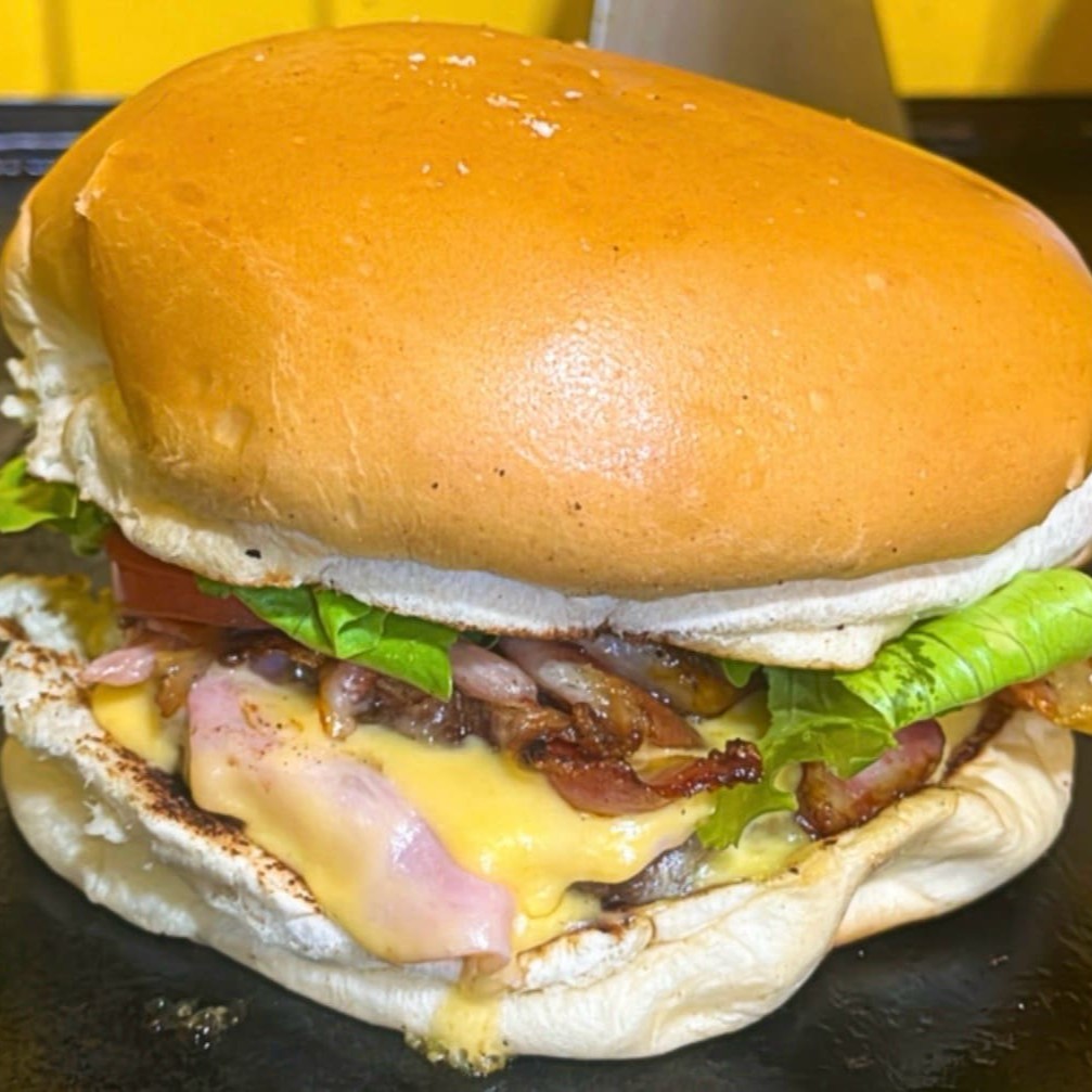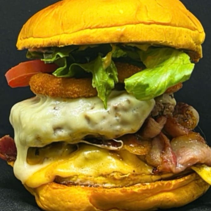 Delicioso lanche feito com pão de brioche, 2 hambúrgueres artesanal de 150g, queijo, alface, tomate, bacon, ovo, onion rings, maionese e molho especial.