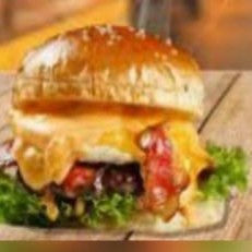 Delicioso lanche Pão, hambúrguer, queijo, alface, tomate, bacon, maionese e molho especial.