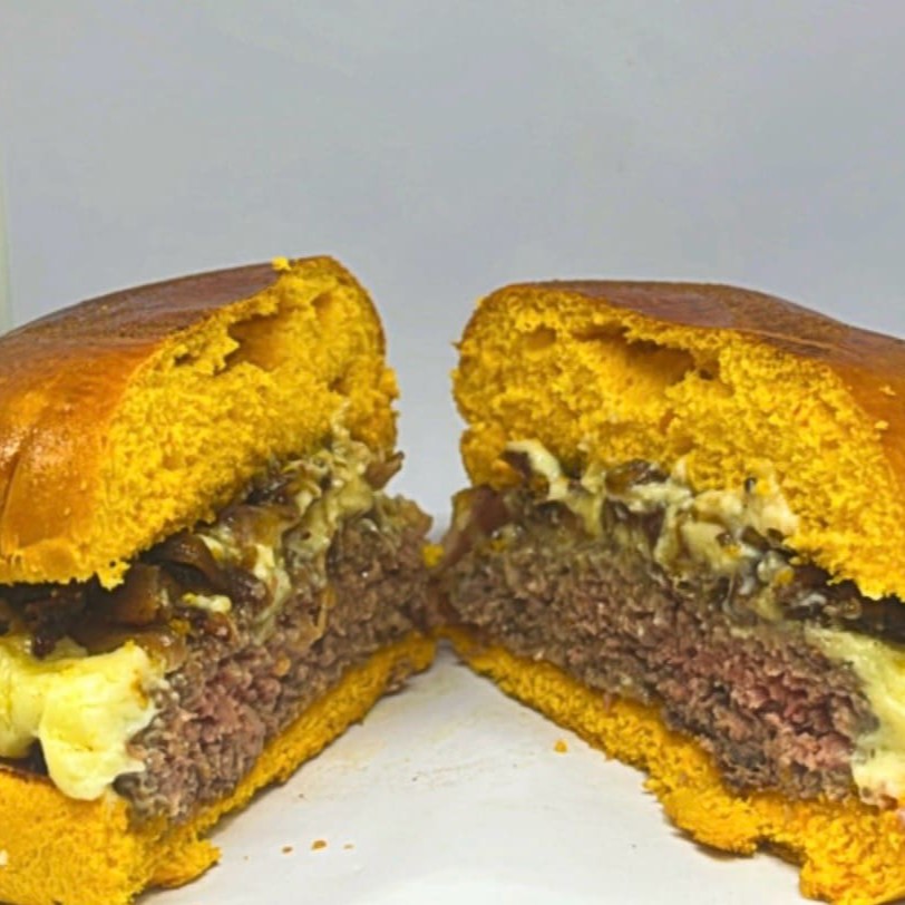 Delicioso lanche feito com pão de brioche, hambúrguer artesanal de 150g, cheddar, bacon, cebola empanada, maionese e molho barbecue.