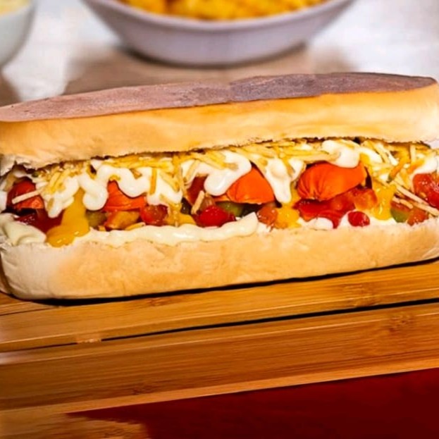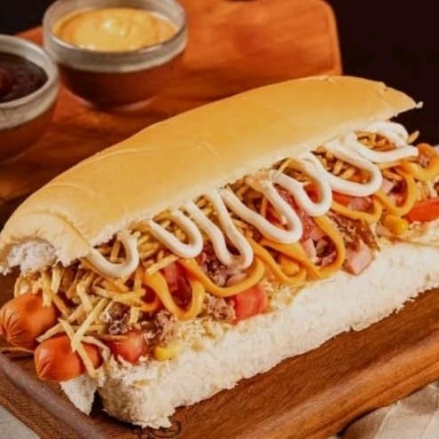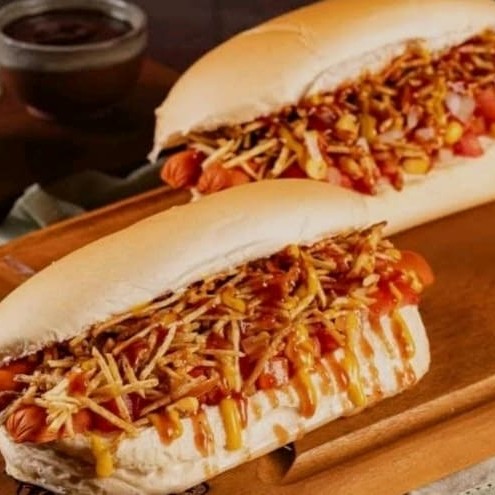 Experimente o máximo em sabor com 2 salsichas Com Molho Especial ,mostarda,Bacon, calabresa, cebola caramelizada,Maionese, Batata Palha, cheddar, Catupiry, Vinagrete e alface.