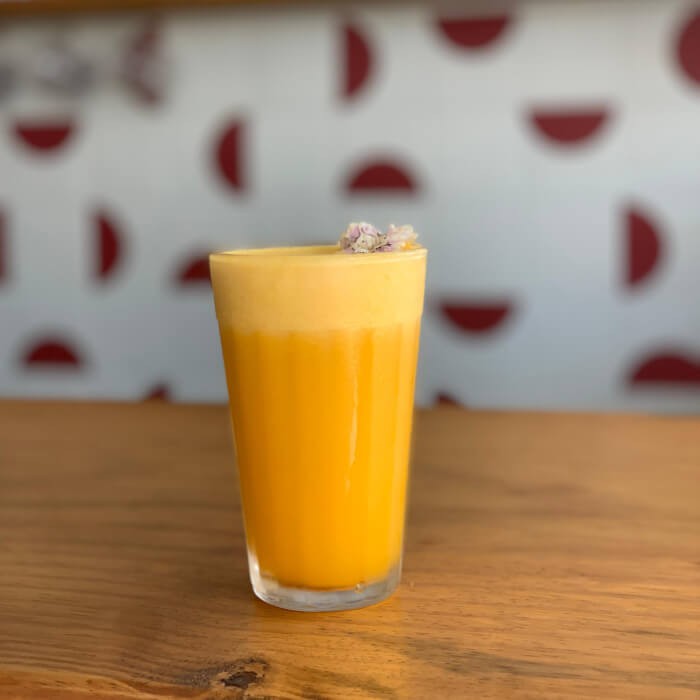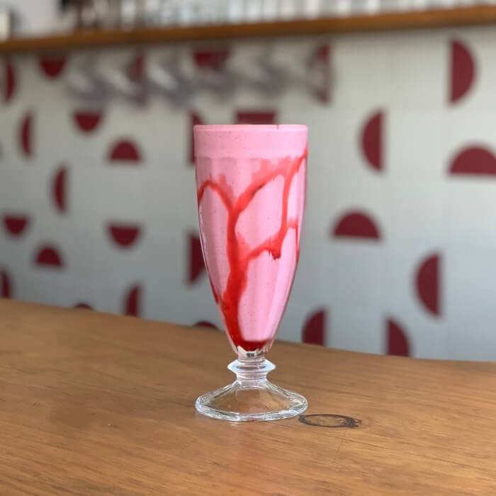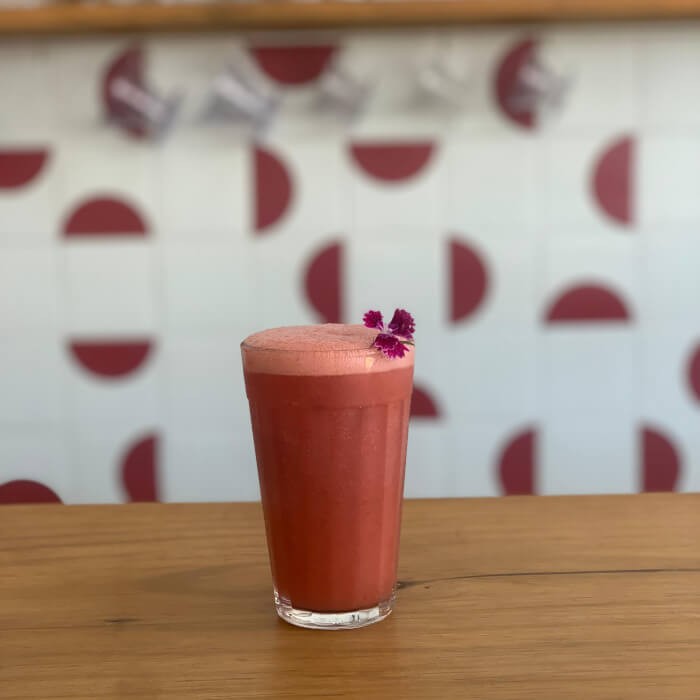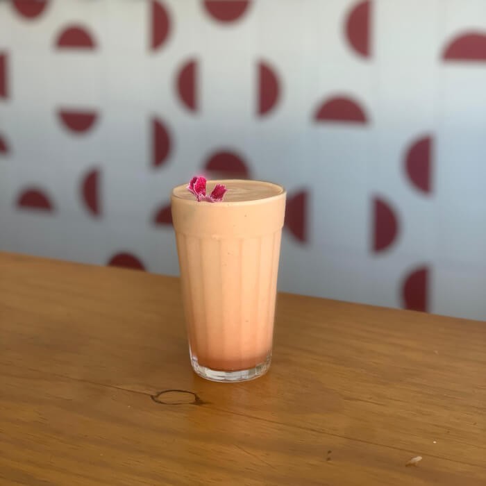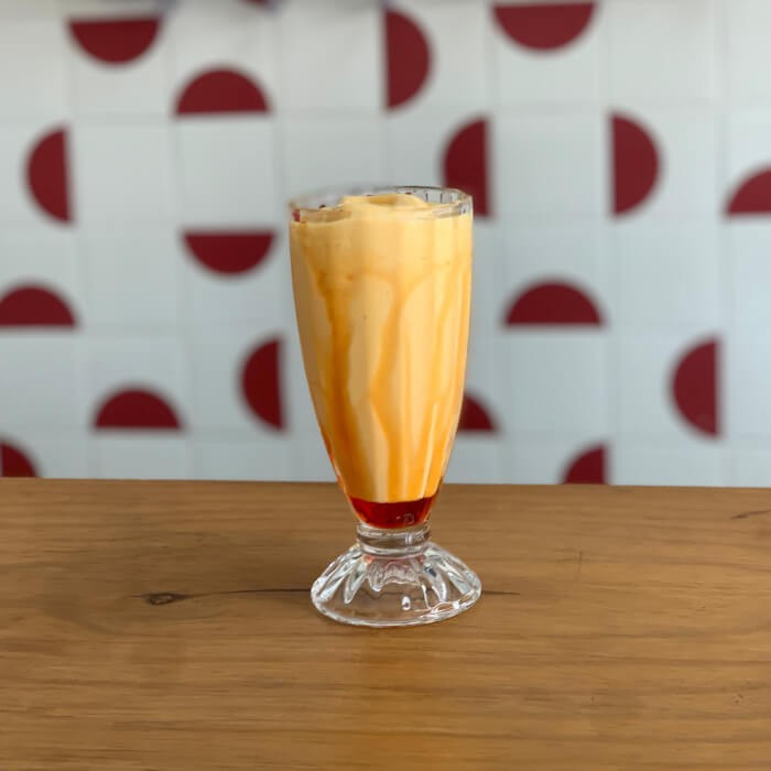 Suco de laranja natural batido com polpa congelada de morango.