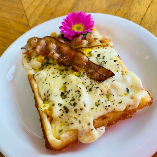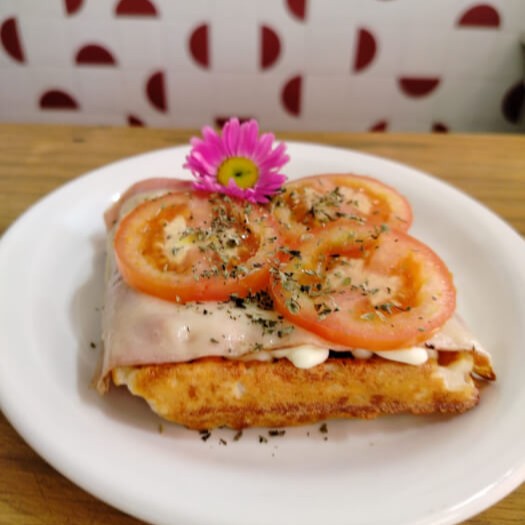 Nosso waffle artesanal feito com massa de pão de queijo, coberto com requeijão cremoso, ovos mexidos, mussarela, bacon e orégano.