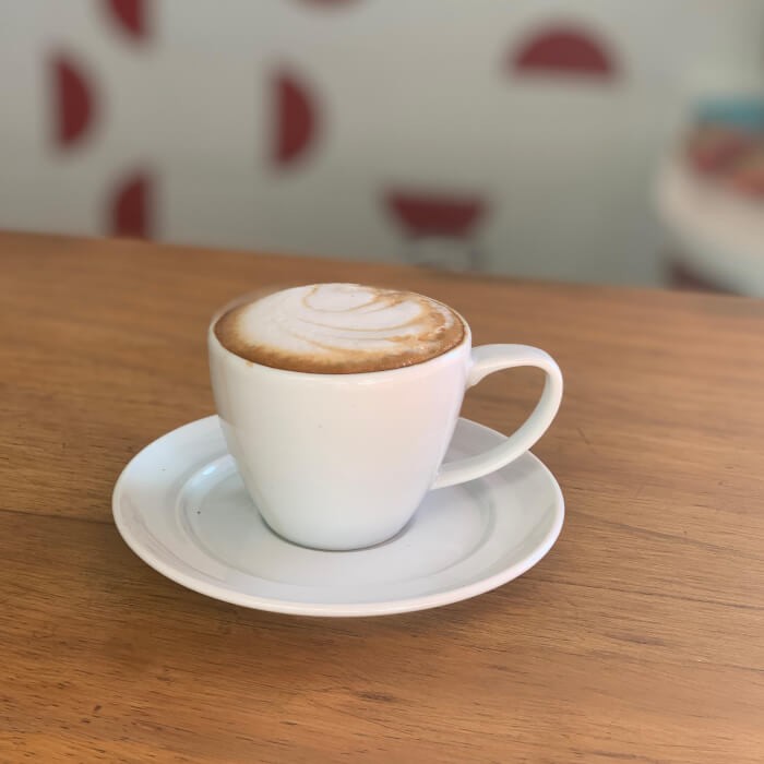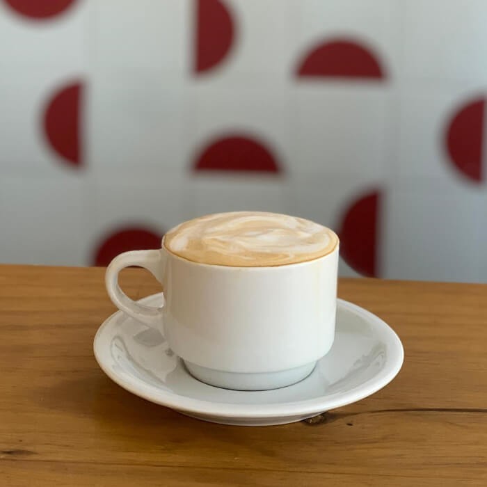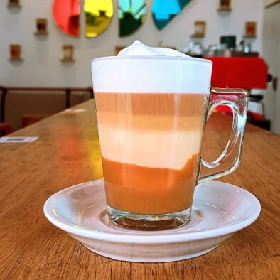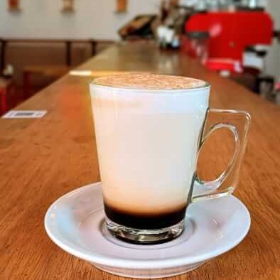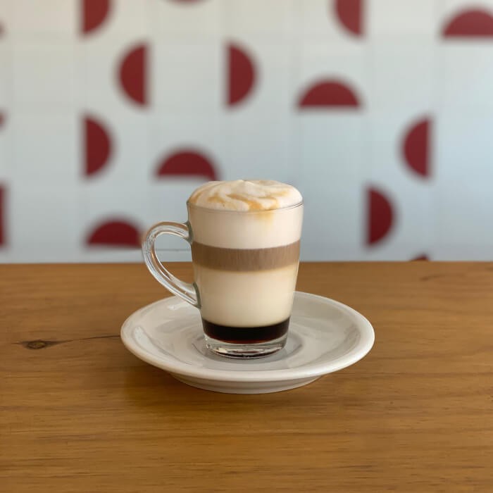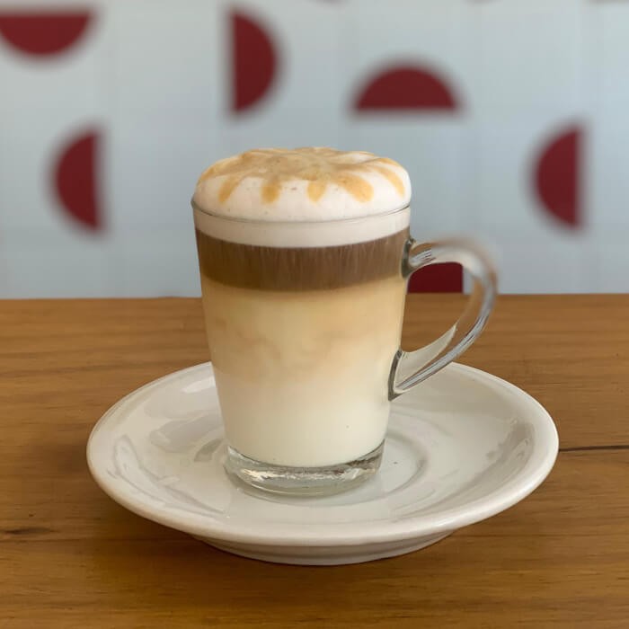 Leite vaporizado, espuma de leite e uma macha de café. Bebida cremosa, adocicada, fácil de beber e linda!