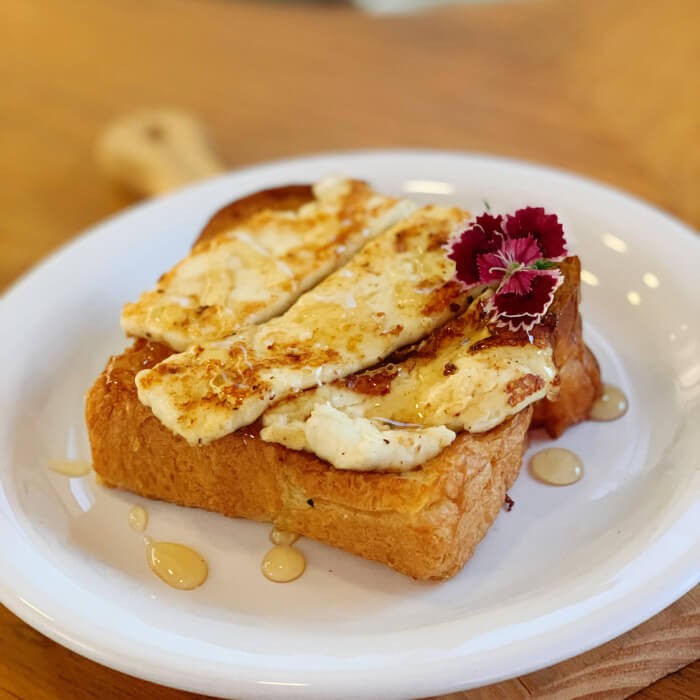Pão de Brioche de fermentação natural, queijo branco chapeado e mel