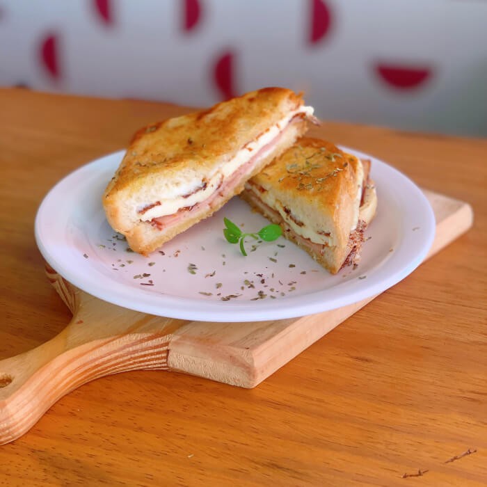 Lanche prensado no pão soft white de fermentação natural com peito de peru e queijo branco.