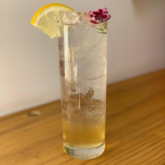 Xarope de limão siciliano, gelo e água gaseificada.