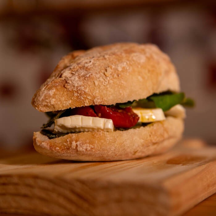 Na baguete francesa de fermentação natural, com molho pesto italiano, tomate confitado, rúcula e queijo branco.