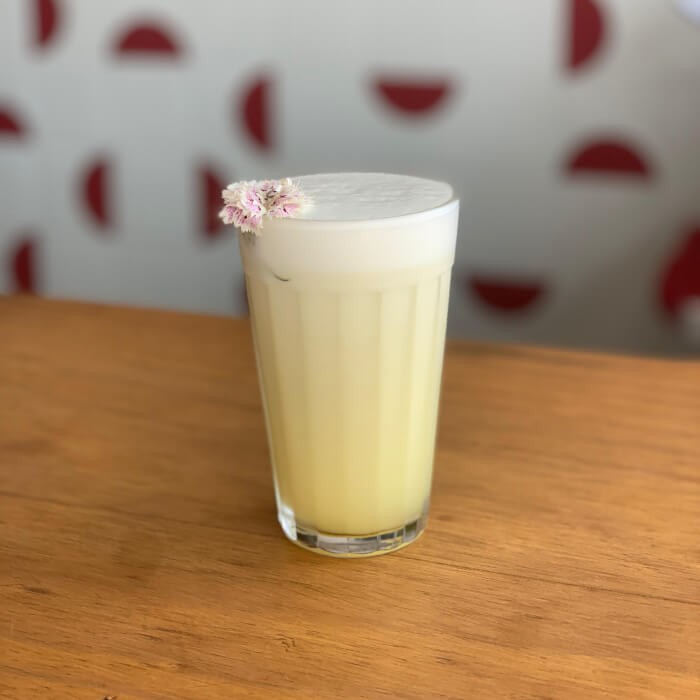 Leite gelado, base em pó de baunilha, polpa de maracujá e gelo.