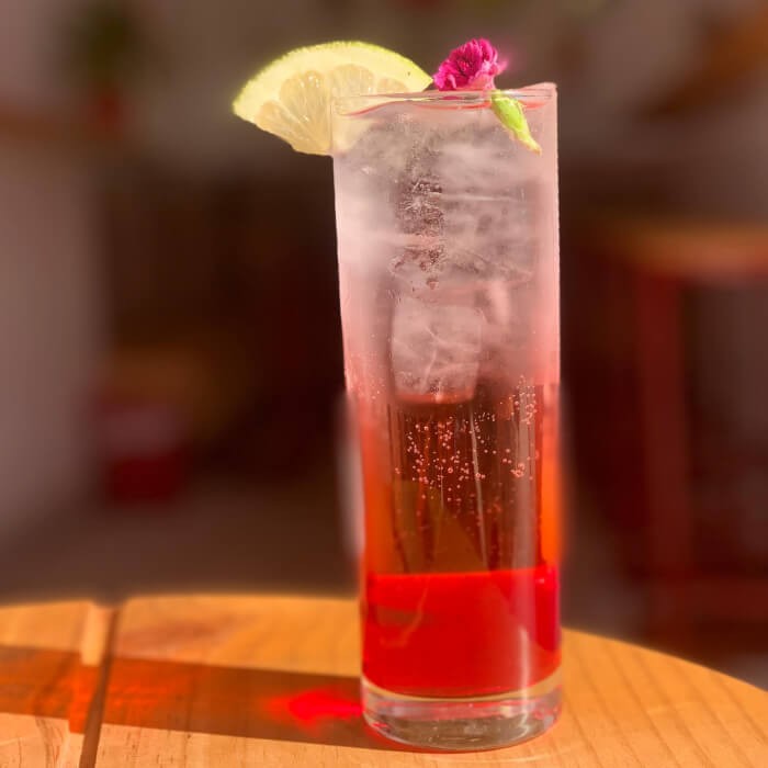 Xarope de frutas vermelhas, gelo e água gaseificada.