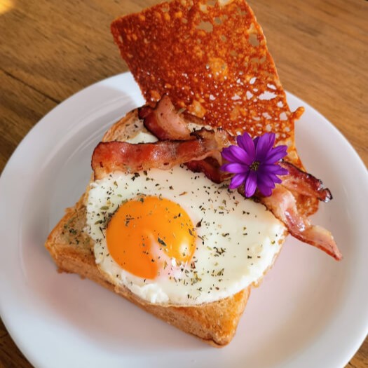 Pão brioche, 2 fatias de bacon, ovo e crosta de mussarela.