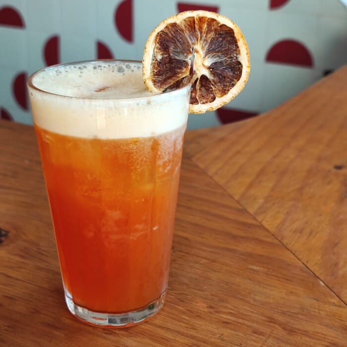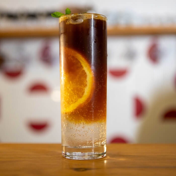 Fatia de laranja Bahia, gelo, tônica e café expresso.
