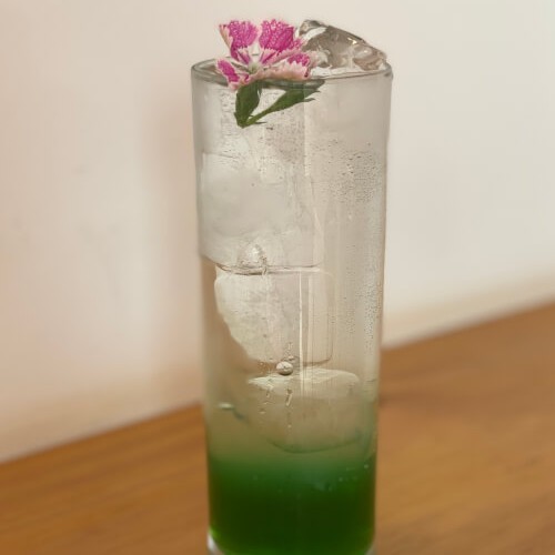 Xarope de maçã verde, gelo e água gaseificada.