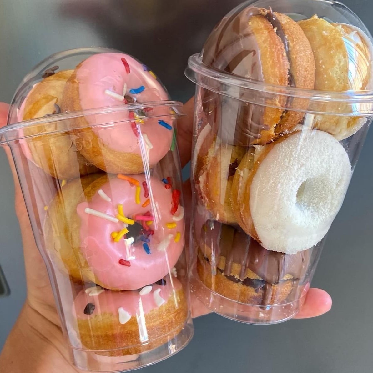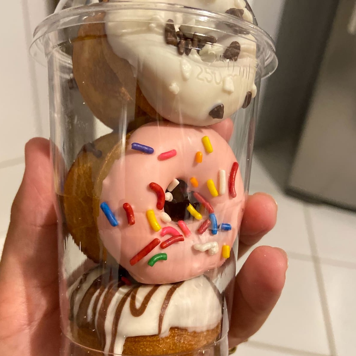 Sem recheio, massa de baunilha super fofinha e saborosa, cobertos com cobertura e confetes! #minidonuts #donuts #combo #coporecheado