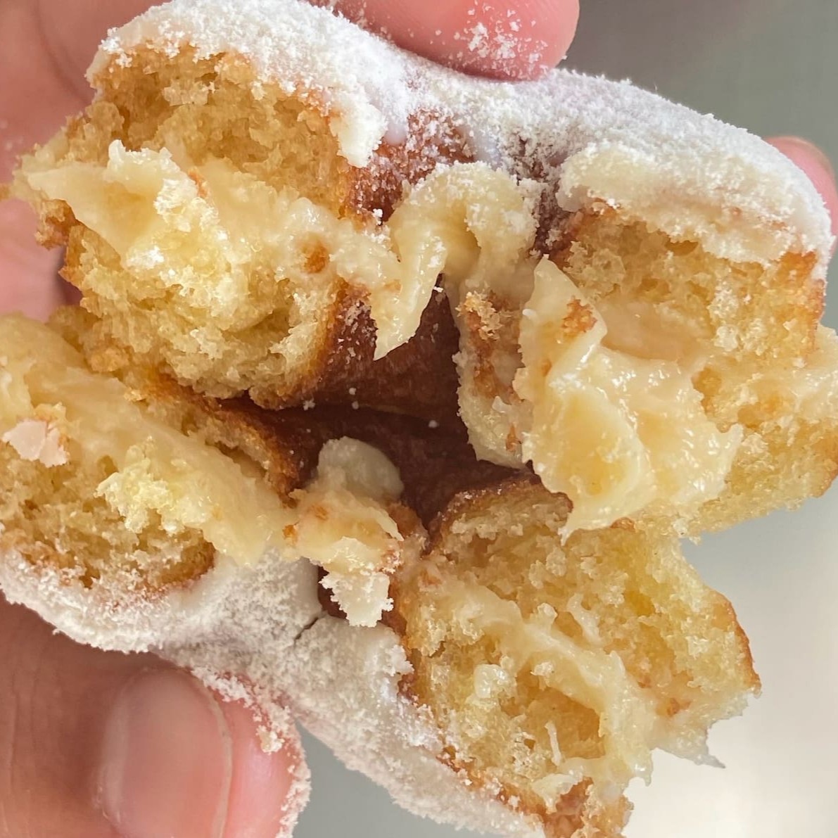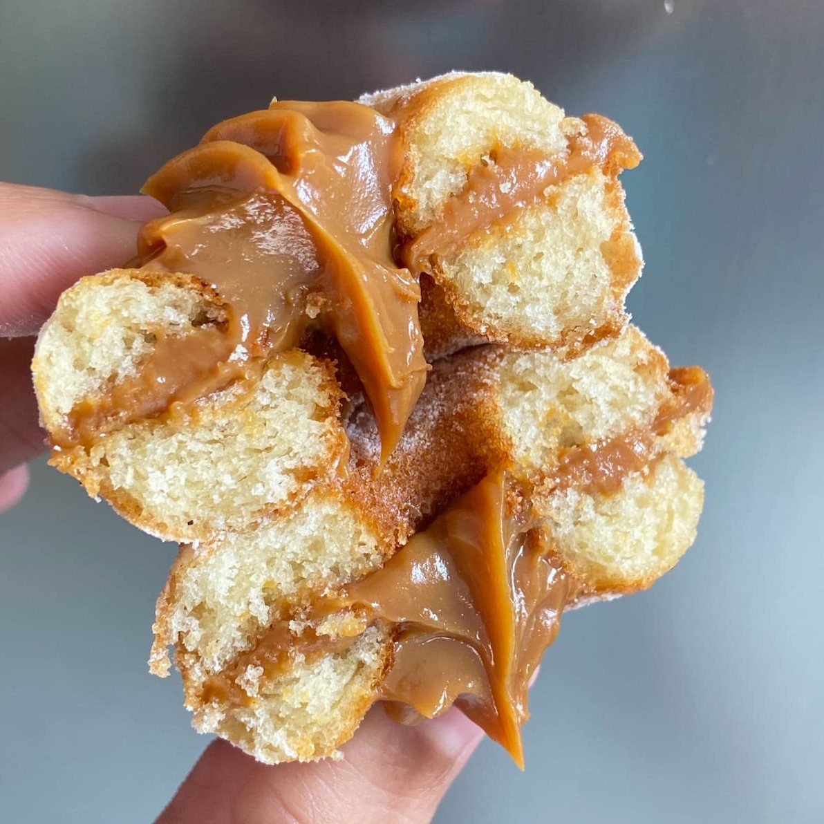 1 mini donuts passado no açúcar com canela e recheado com doce de leite, massa de baunilha super fofinha e saborosa! #minidonuts #docedeleite #doces #sobremesas
