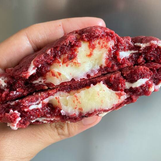 Cookie, feito com massa artesanal de Red Velvet recheado com brigadeiro de ninho 90g #cookie #cookierecheado