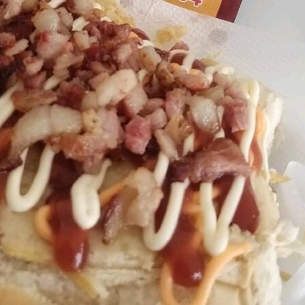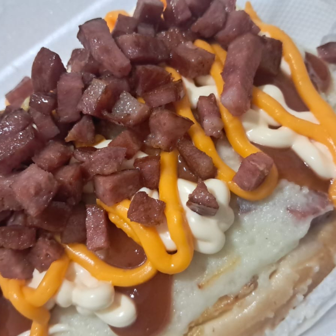 Pão , 2 salsicha , salada ( repolho e tomate ) , batata palha , bacon , purê de batata , maionese , ketchup , cheddar , bacon