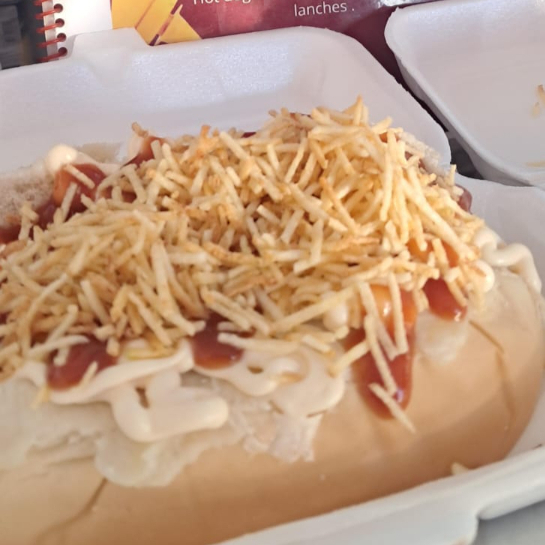 Pão , 2 salsicha , salada ( repolho e tomate ) , batata palha , pedaços de frango , purê de batata , maionese , ketchup , cheddar , pedaços de frango