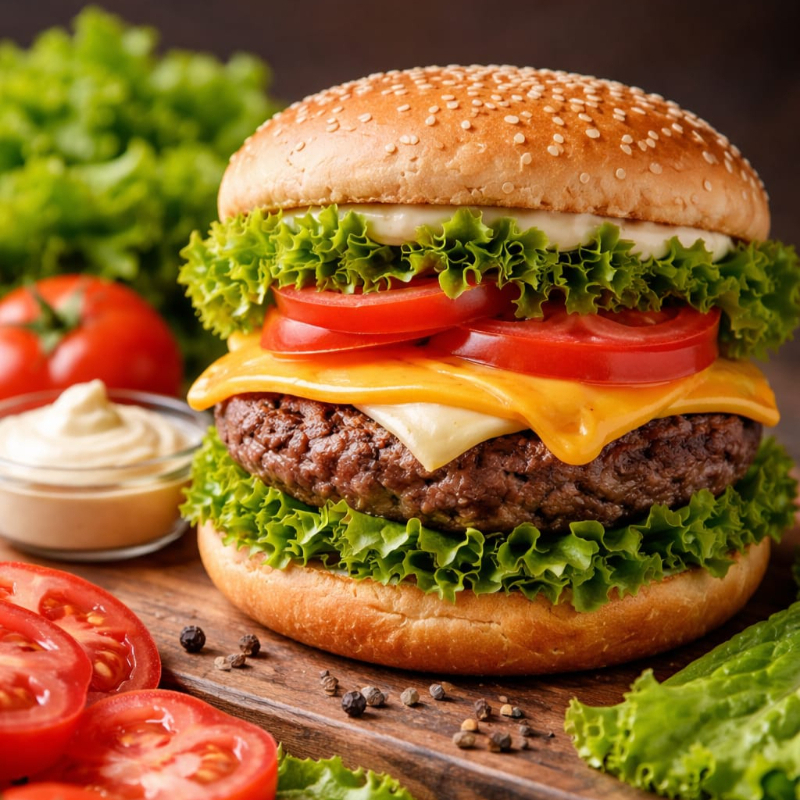 Pão , hamburguer , queijo , alface , tomate , maionese , cheddar