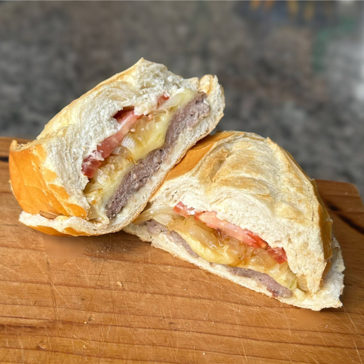 Pão Francês ( baguete) , maionese, Hambúrguer artesanal de Costela, tomate, cebola dourada na chapa, queijo musssarela.