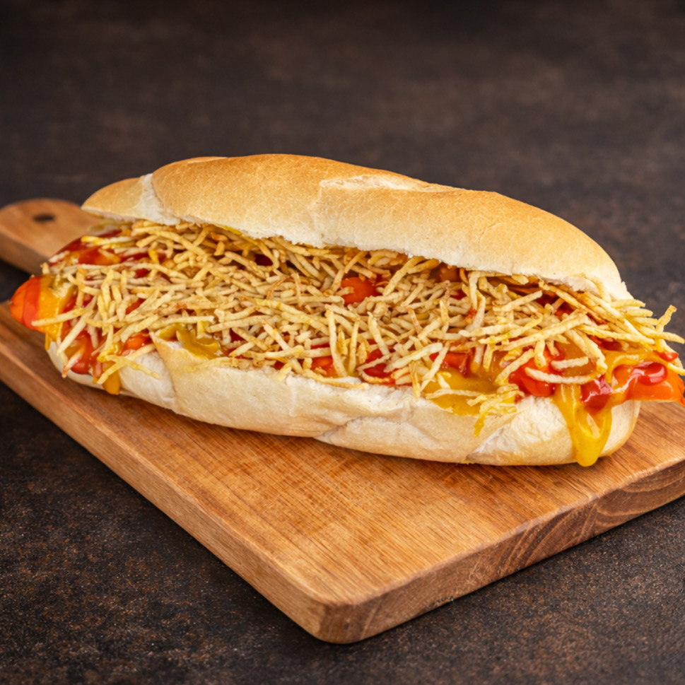 Pão francês (baguete), 2 salsichas hot dog perdigão, maionese, ketchup, mostarda e batata palha.