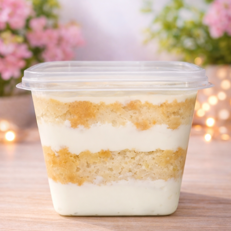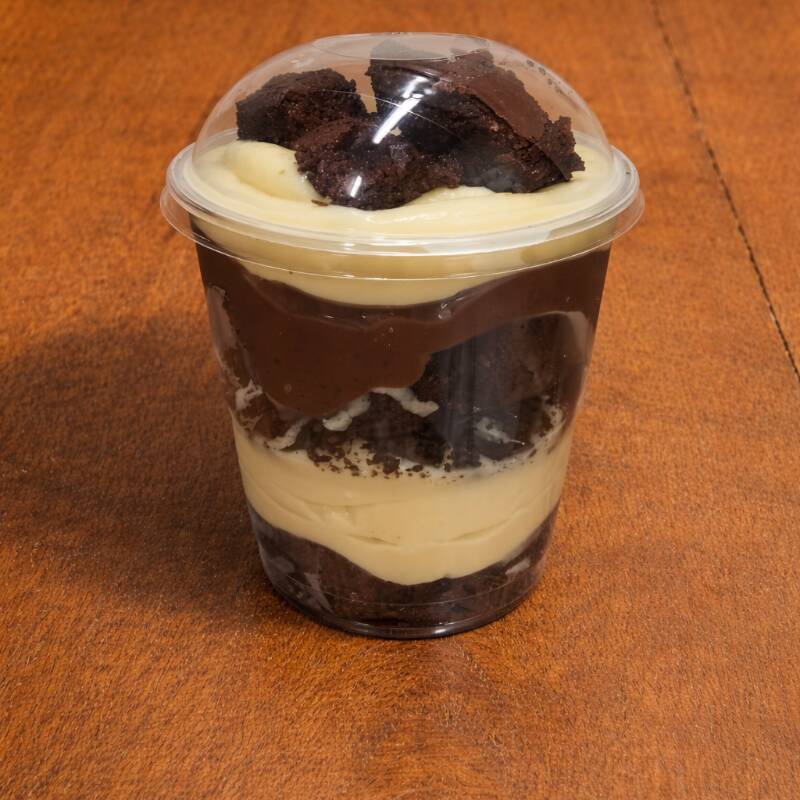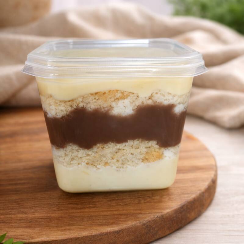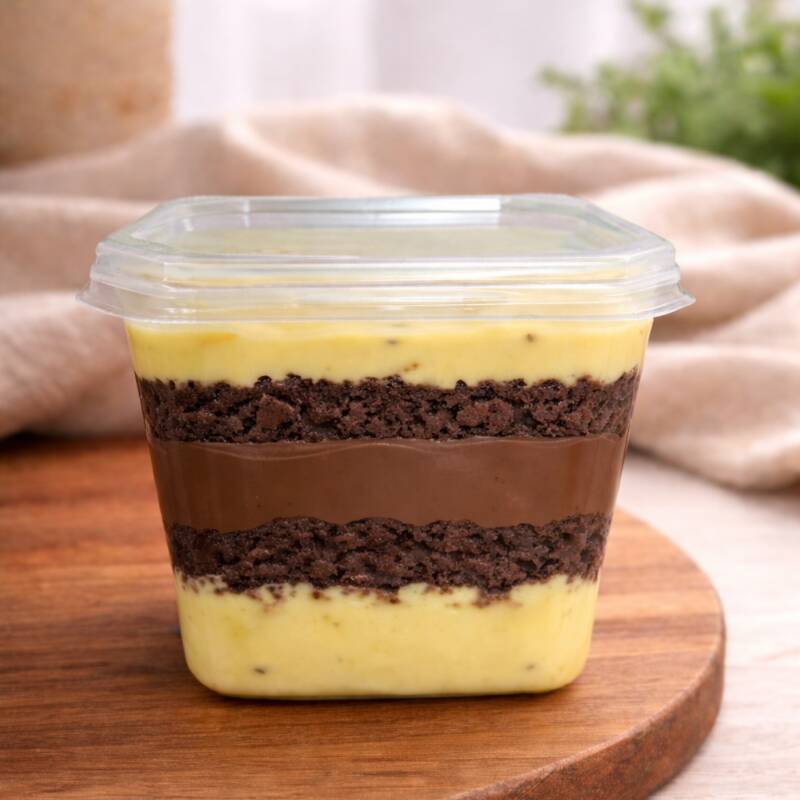 Bolo de pote artesanal com massa fofinha, recheado com brigadeiro de Ninho e brigadeiro de chocolate cremoso. Uma combinação clássica e irresistível.