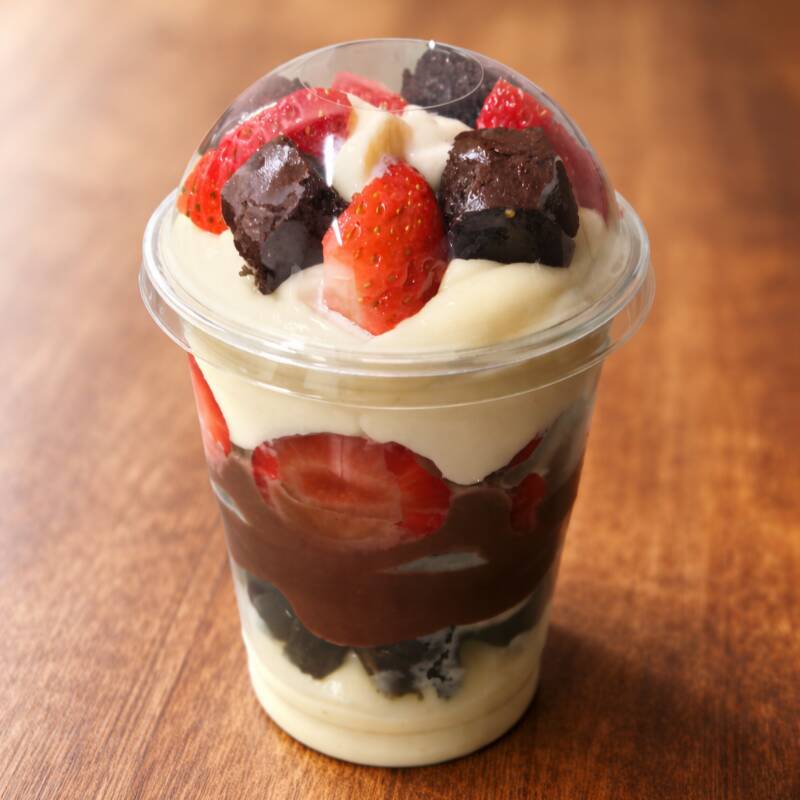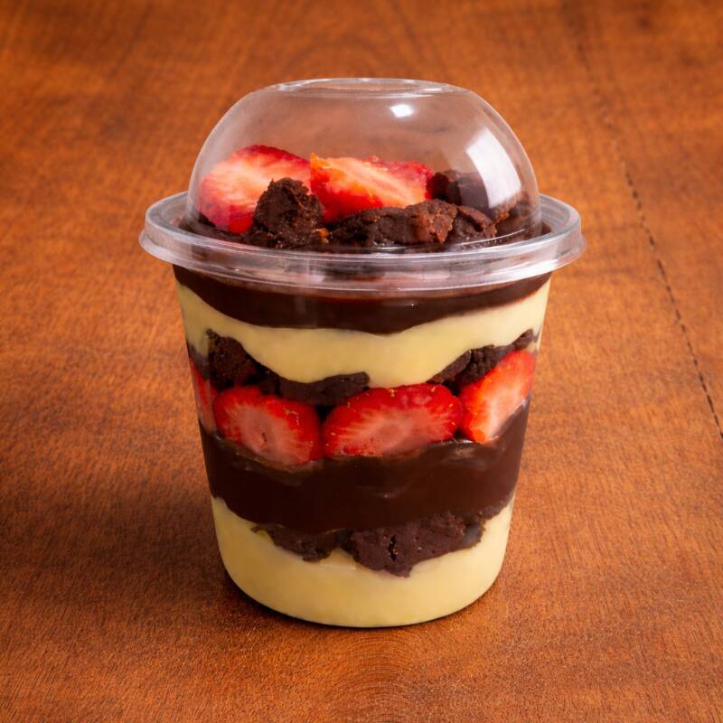 Nosso copo da felicidade é montado com brownie intercalado com brigadeiro de Ninho super cremoso, brigadeiro meio amargo e morangos frescos, criando um equilíbrio irresistível entre doçura, intensidade e frescor.
