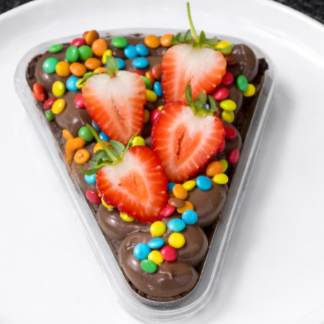 Nosso brownie é macio, intenso no chocolate, coberto com brigadeiro cremoso, morangos frescos e finalizado com confetes coloridos, que trazem um toque extra de crocância a cada mordida.