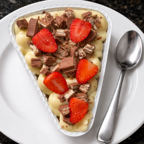 Nosso Brownie é feito com camadas generosas, macio e chocolatudo, intercaladas com brigadeiro de Ninho cremoso, morangos frescos e finalizado com pedaços crocantes de Kitkat, trazendo o equilíbrio perfeito entre cremosidade, frescor e crocância.