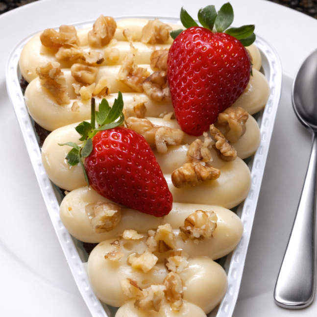 Nosso brownie é super macio, intenso no chocolate, coberto com um brigadeiro de Ninho finalizado com morangos frescos e nozes, trazendo o equilíbrio perfeito entre o doce na medida certa a leve acidez da fruta e a crocância das nozes.