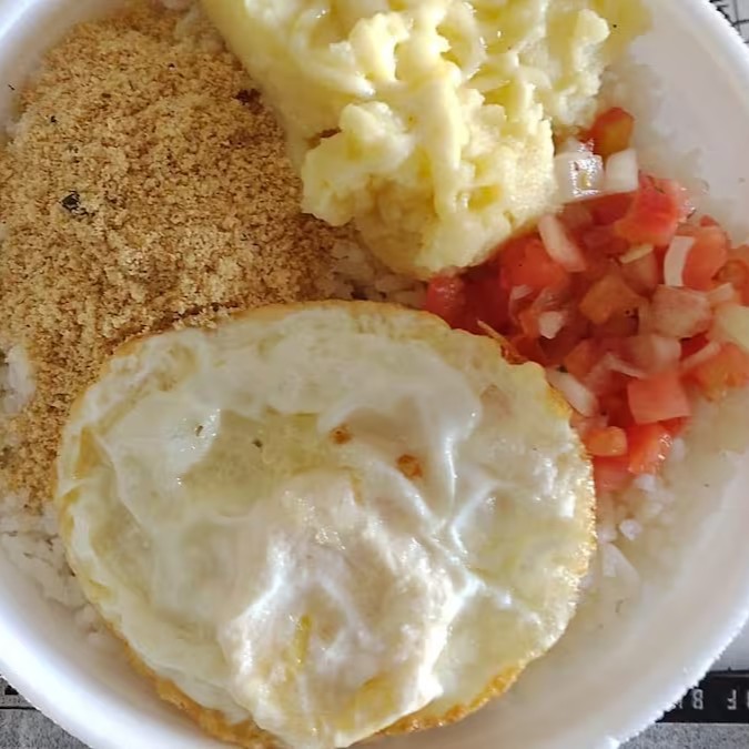 Marmita tamanho P de Ovo frito, Sendo: 80 gramas de feijão, 200 gramas de arroz, 70 gramas de purê de batata com queijo ou macarronada, 1 potinho de salada, farofa e 1ovo frito. *Não é possível substituir nenhum item.*
